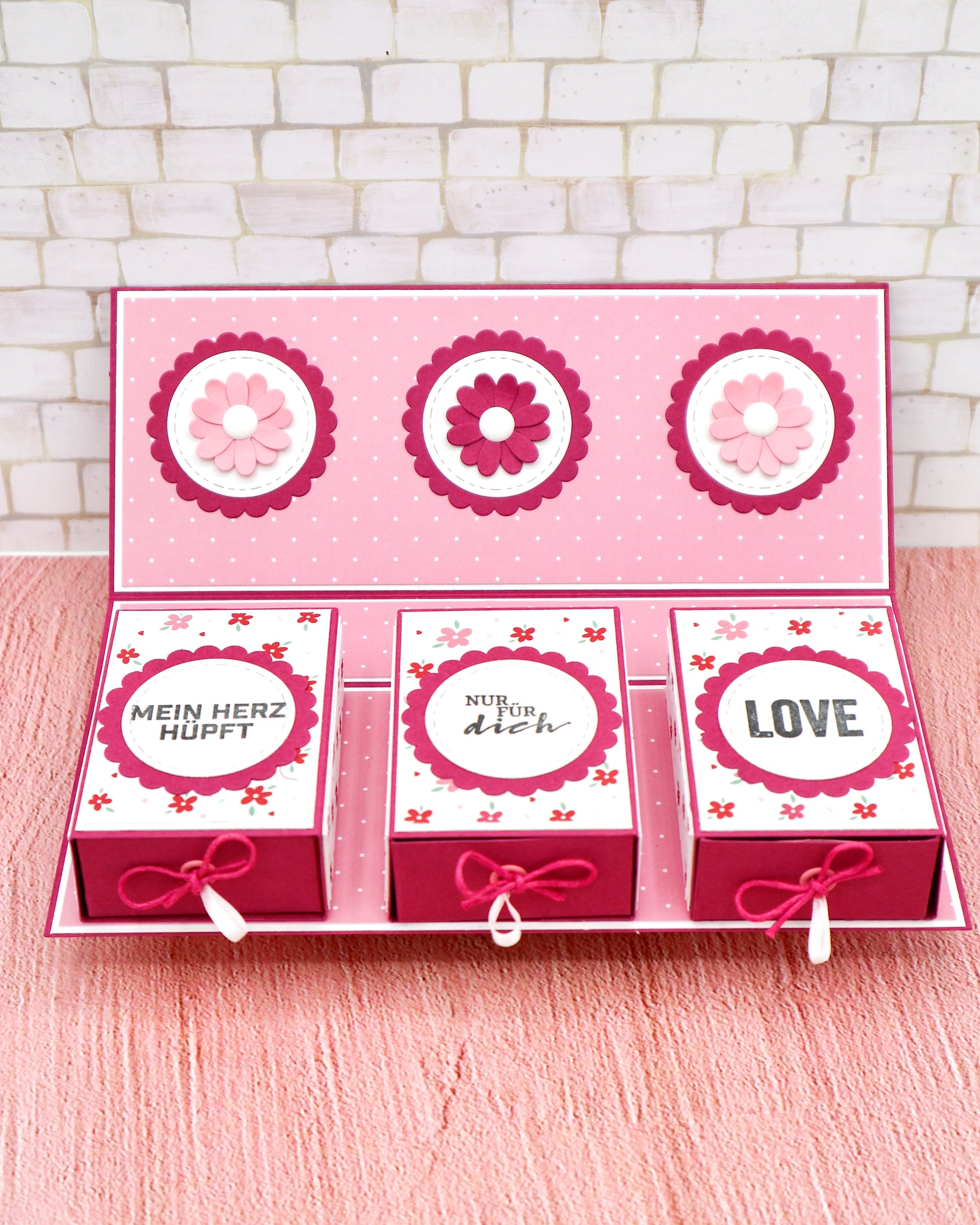 Überrasche deine Liebsten mit dieser Geschenkbox Karte zum Valentinstag! Das besondere Design verbirgt drei praktische Schubladen, perfekt um kleine Aufmerksamkeiten, Süßigkeiten oder liebevolle Botschaften zu verstecken.