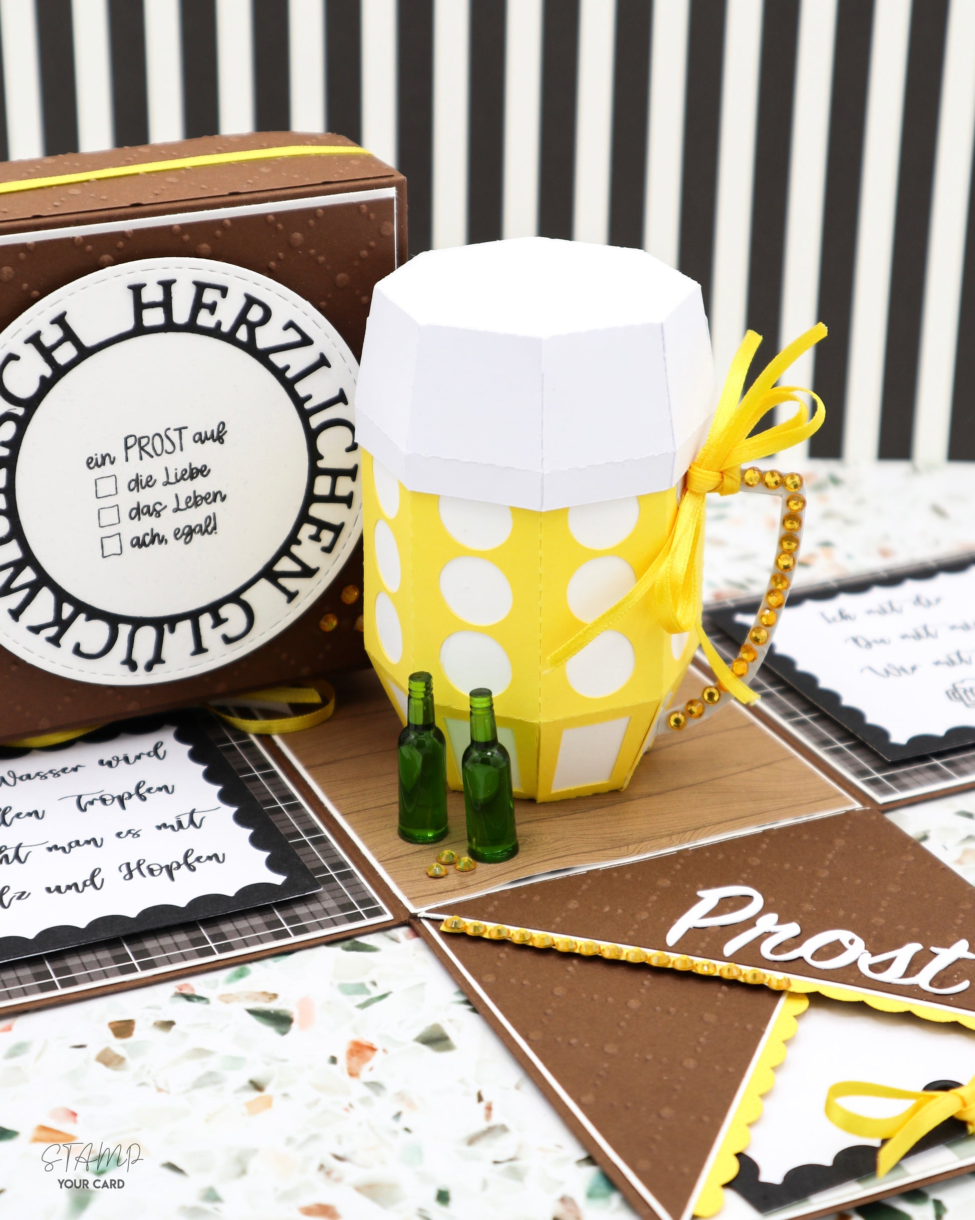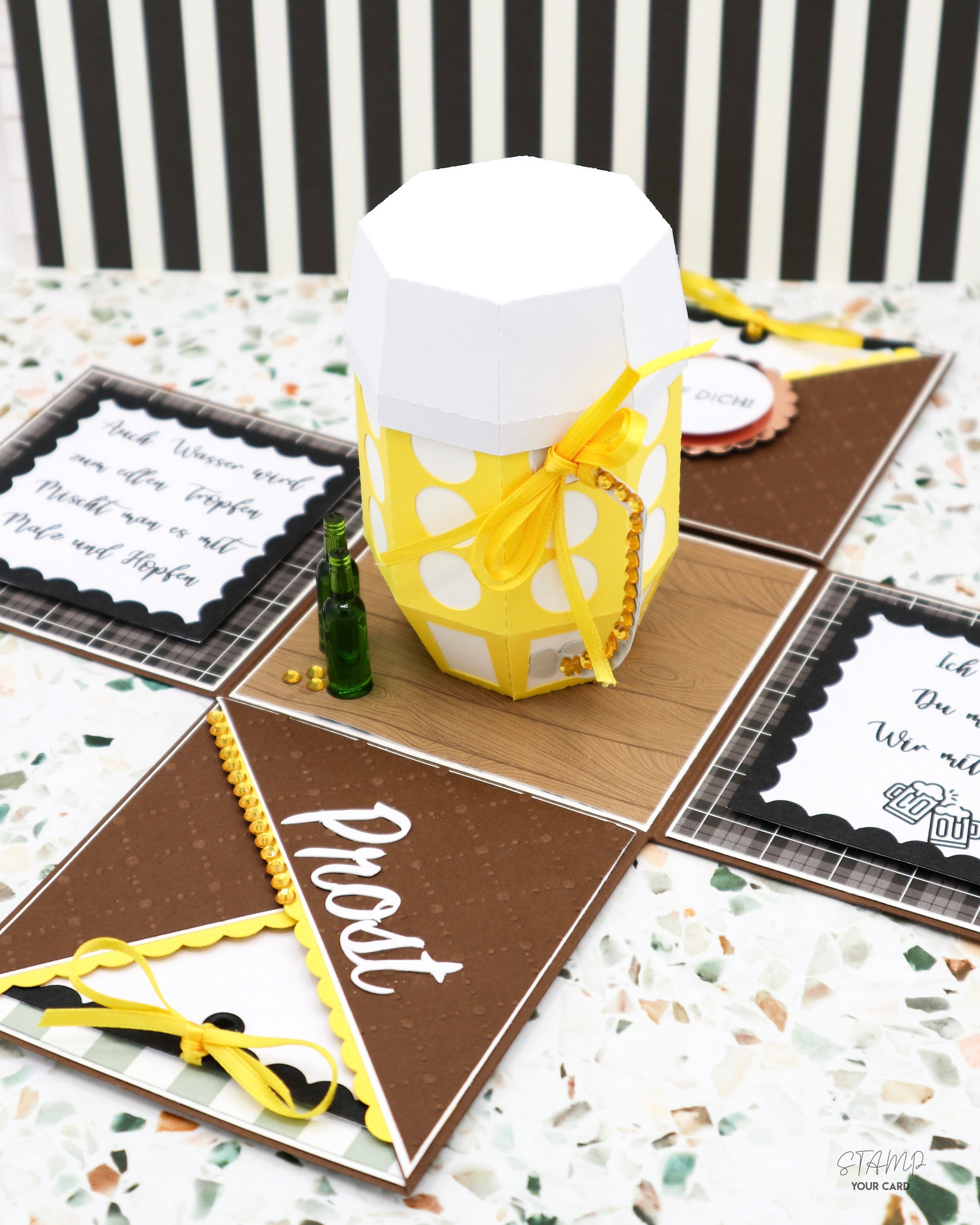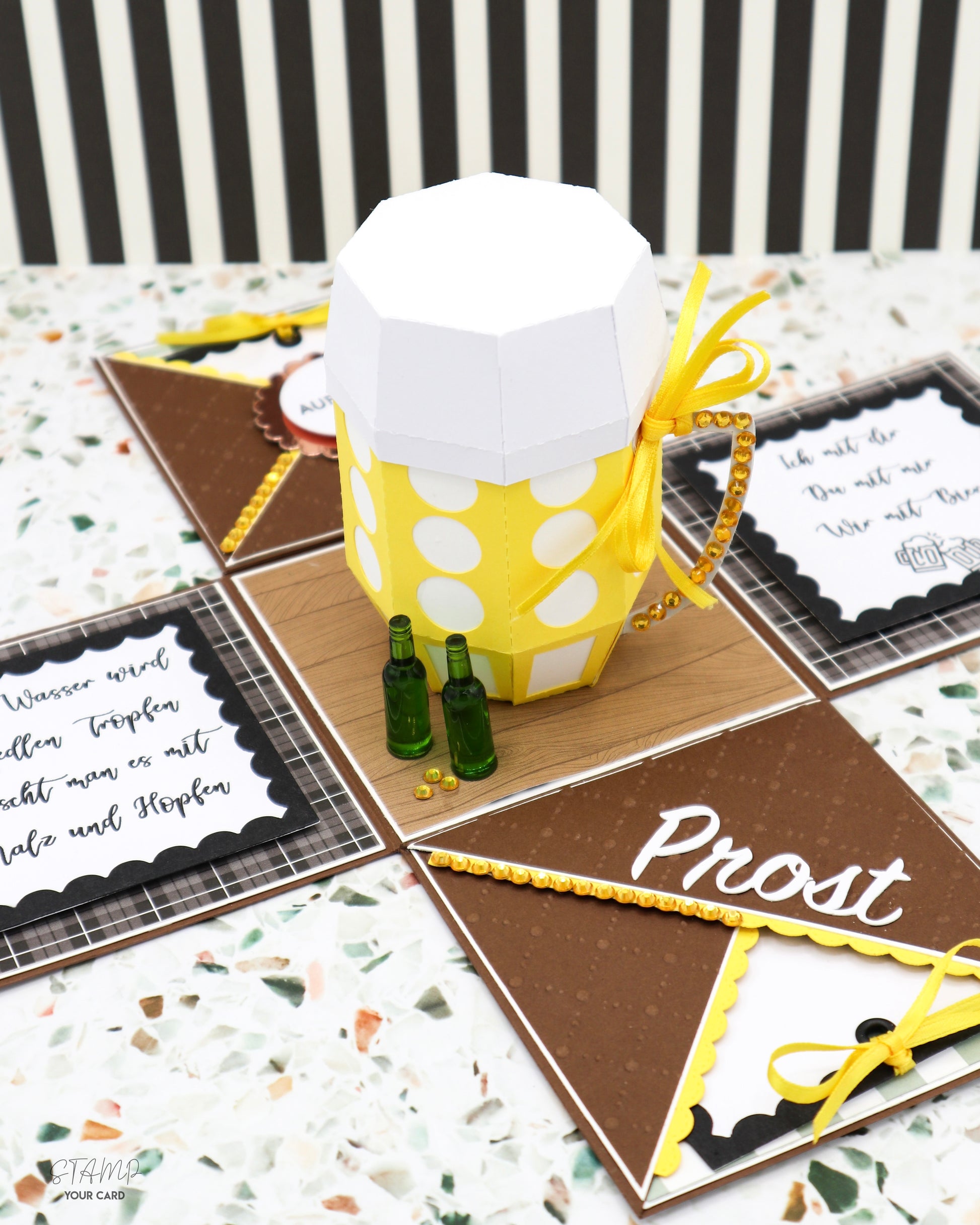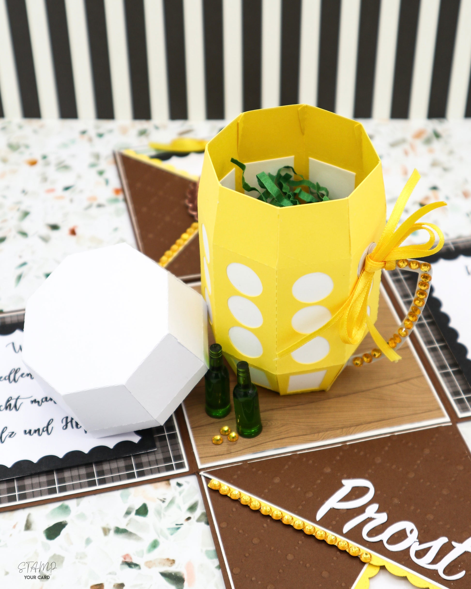 In das Bierglas in der Mitte könnt ihr eine Kleinigkeit verstecken, wie zum Beispiel Süßigkeiten.