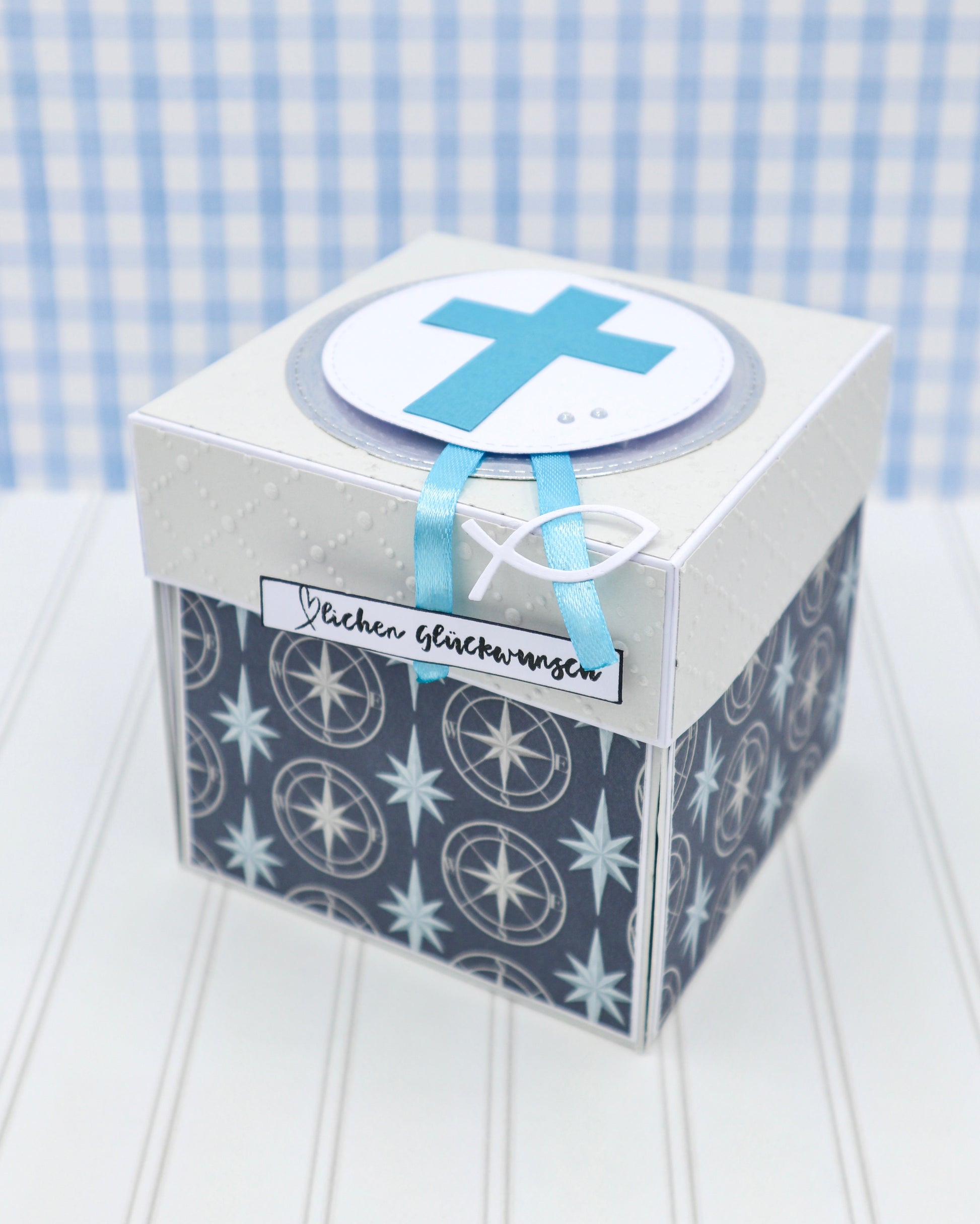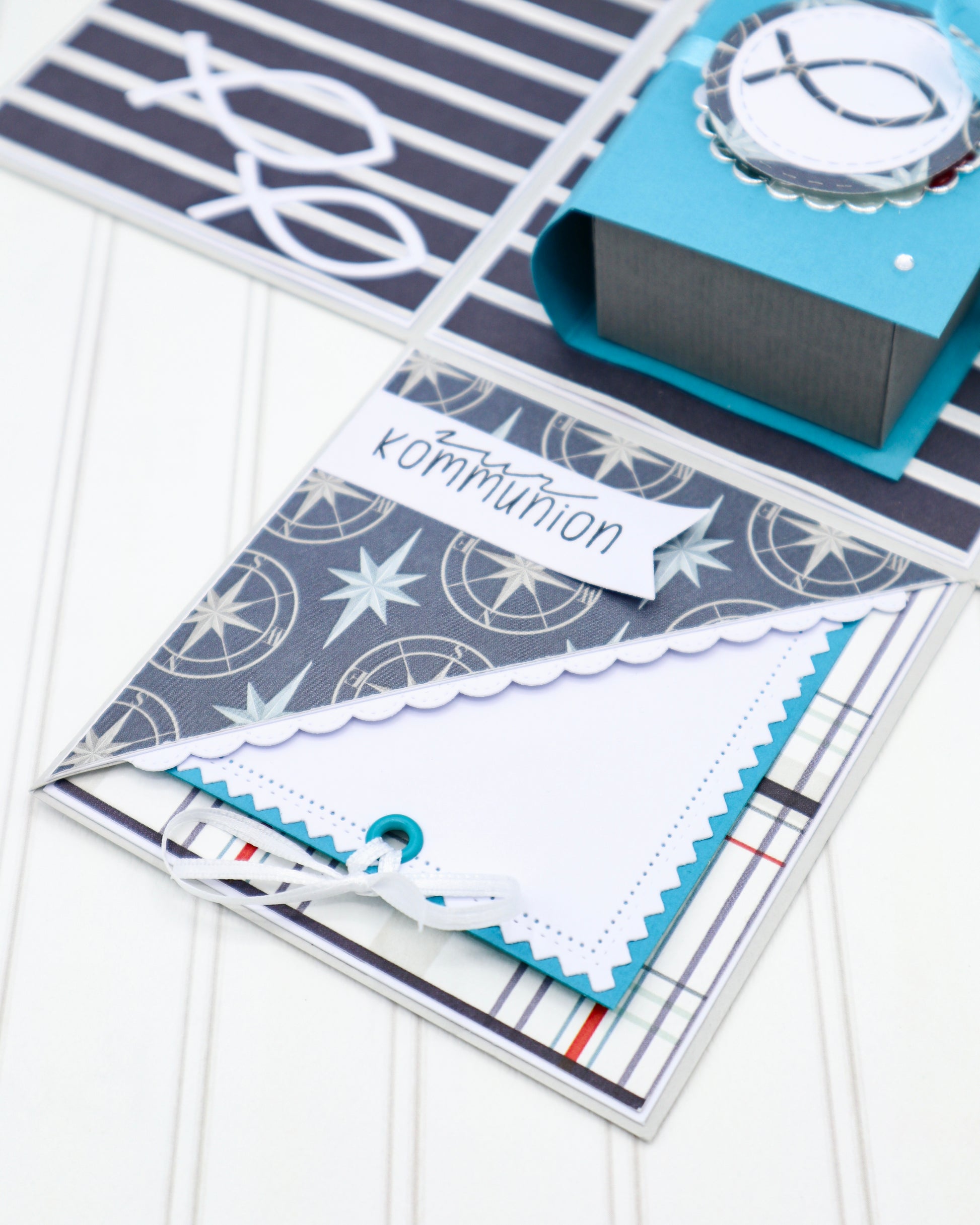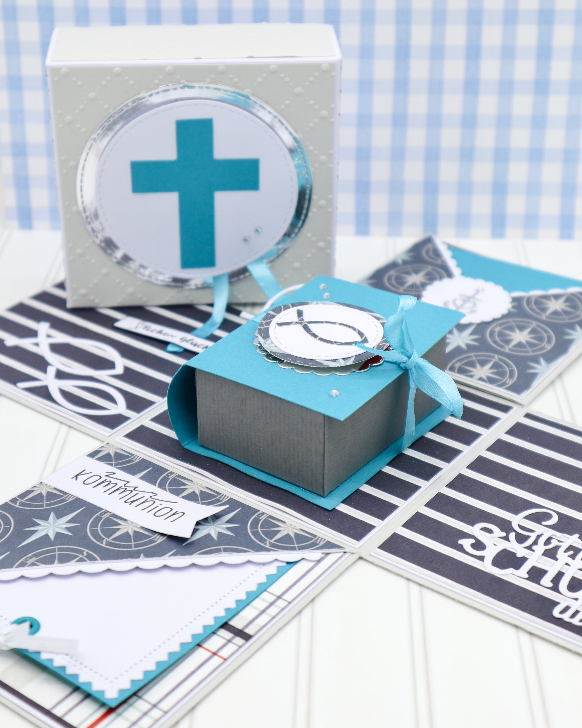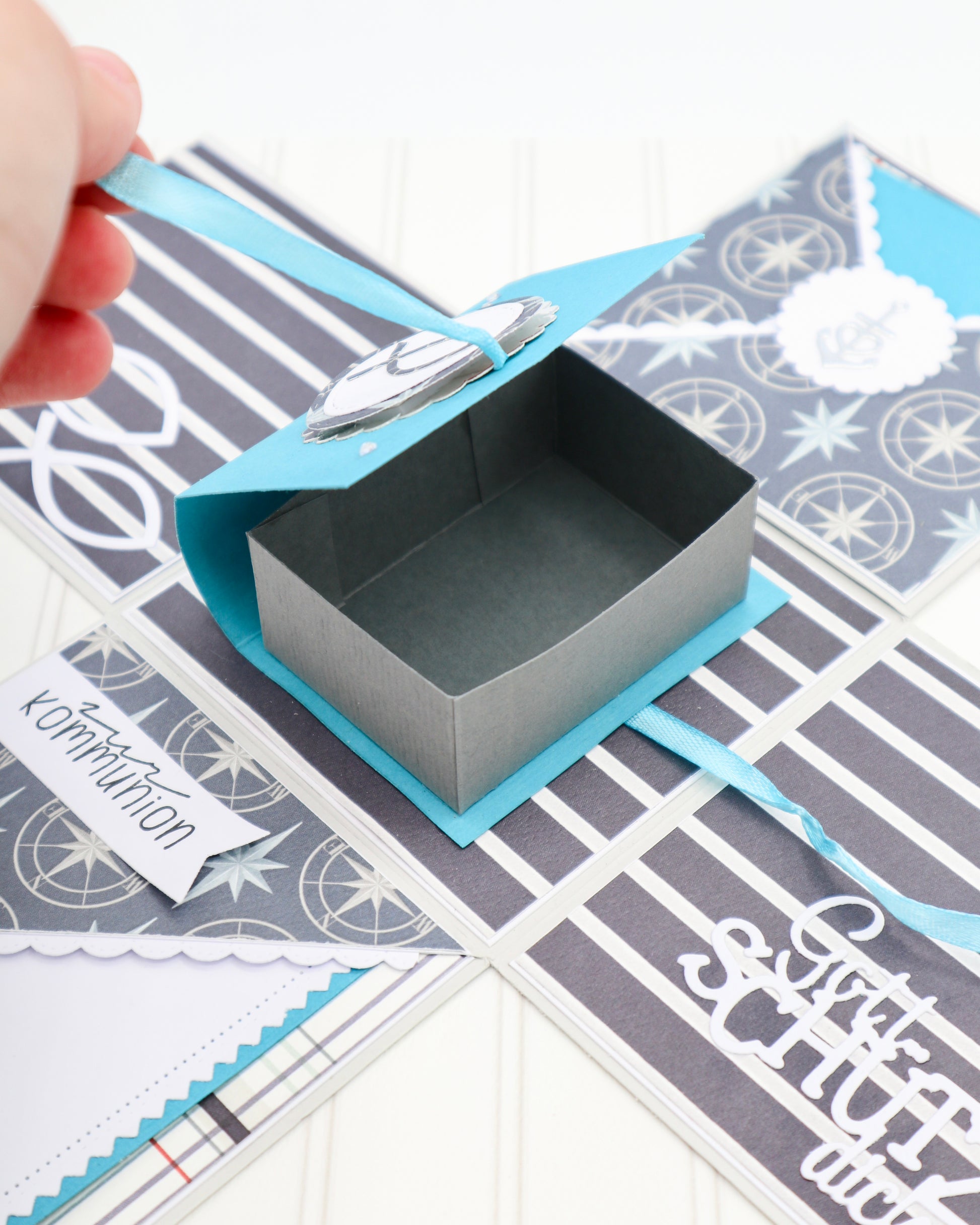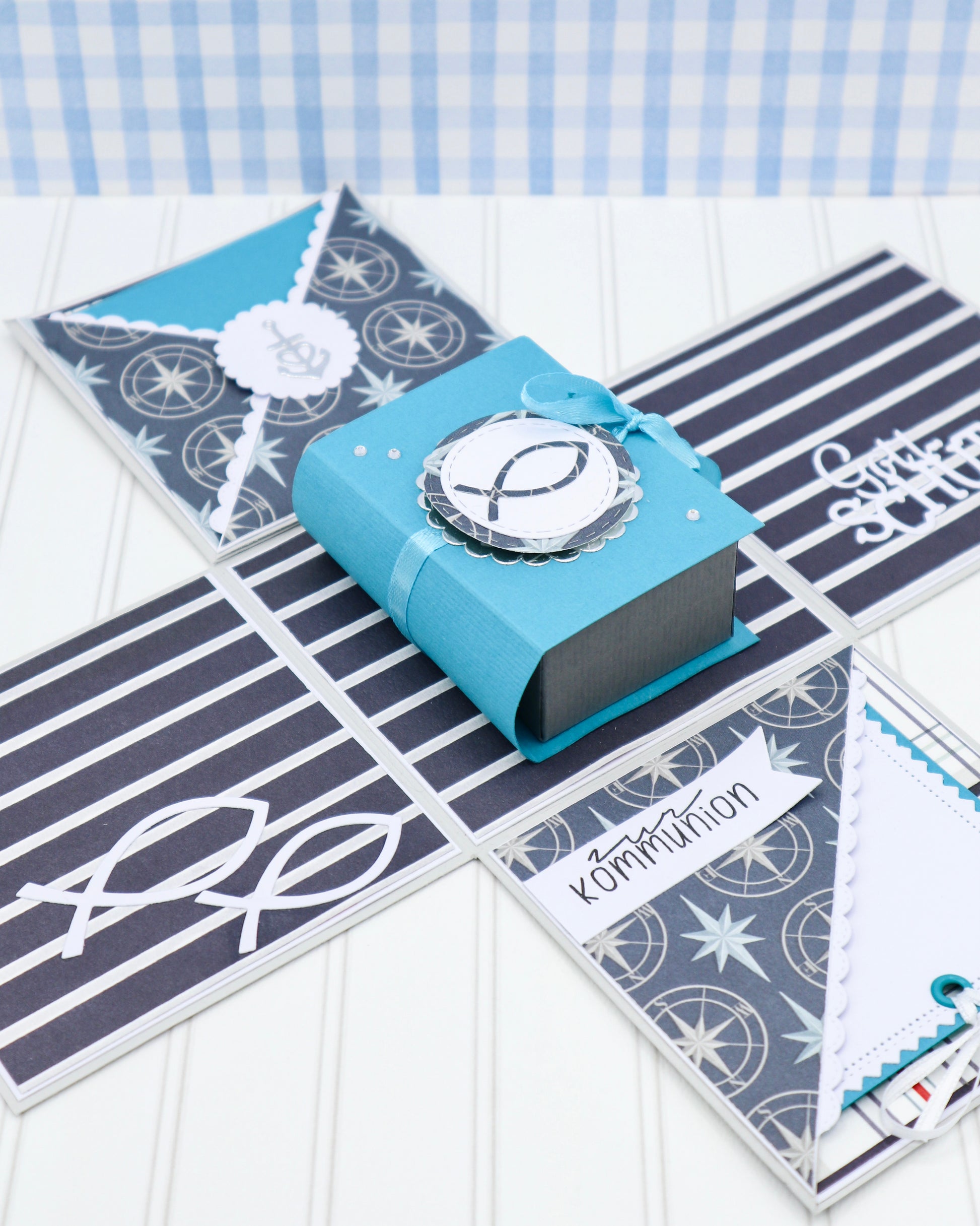 Beim Aufklappen der Box fallen alle vier Seiten auseinander. In der Mitte befindet sich ein Buch, das man öffnen kann, um darin ein kleines Geschenk zur Kommunion zu verschenken.