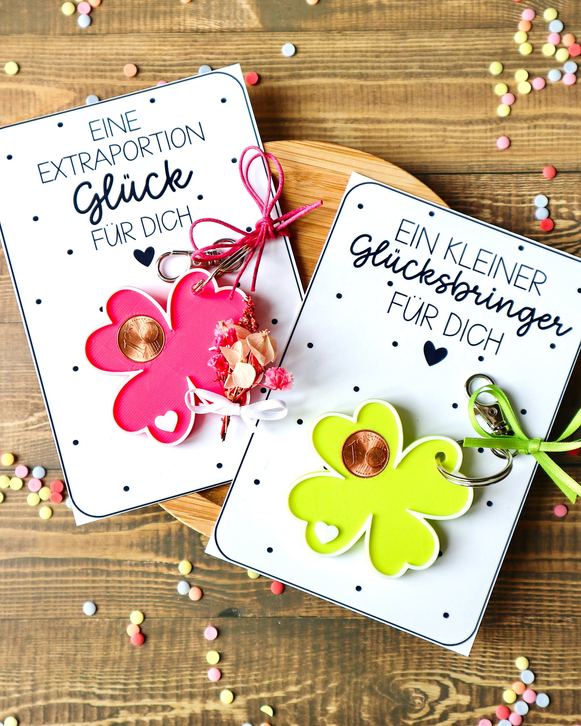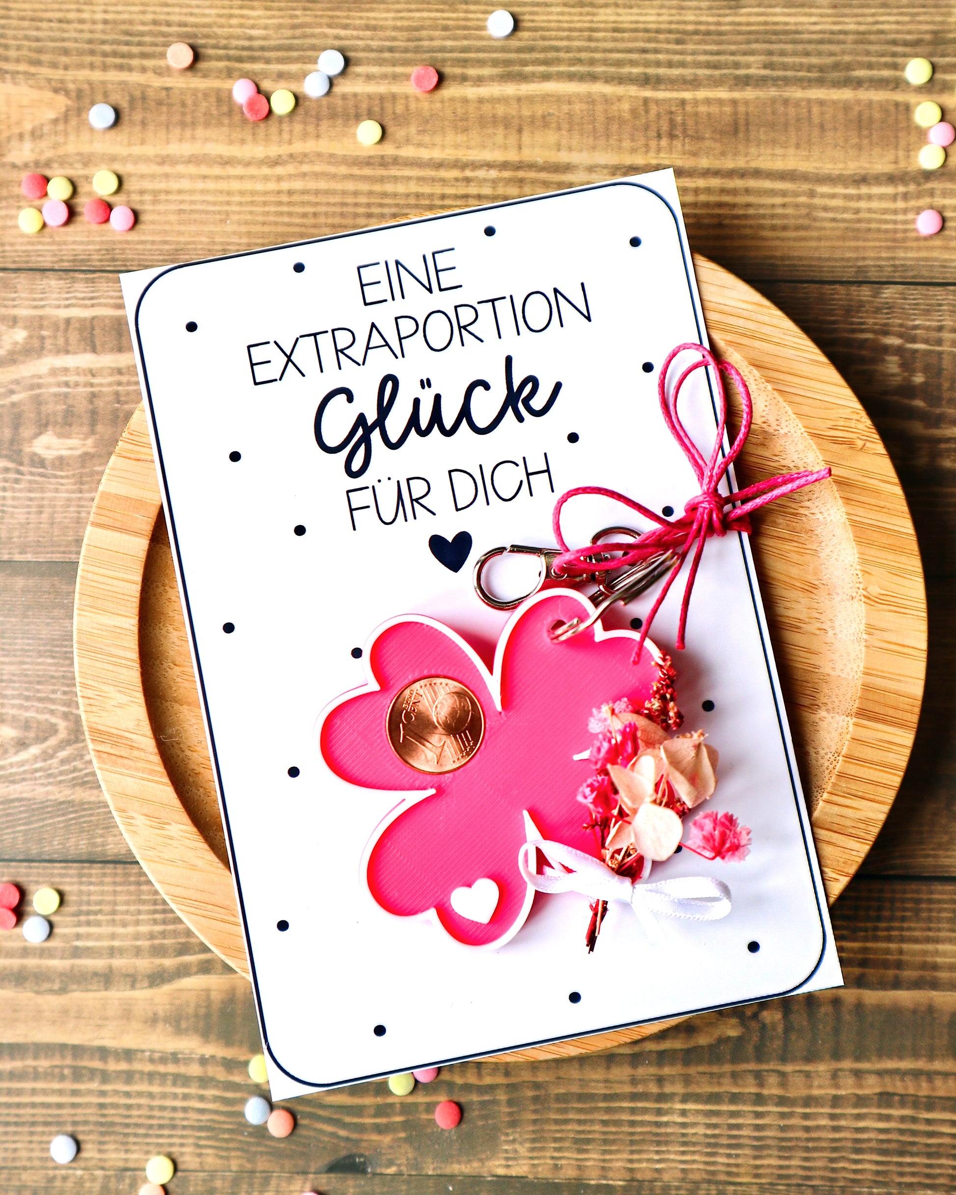 Jeder Glücksbringer kommt auf einer hochwertigen Geschenkkarte mit liebevollem Spruch – bereit zum Verschenken oder Selbstbehalten. Der rosafarbene Schlüsselanhänger wird zusätzlich mit Kunstblumen verziert.