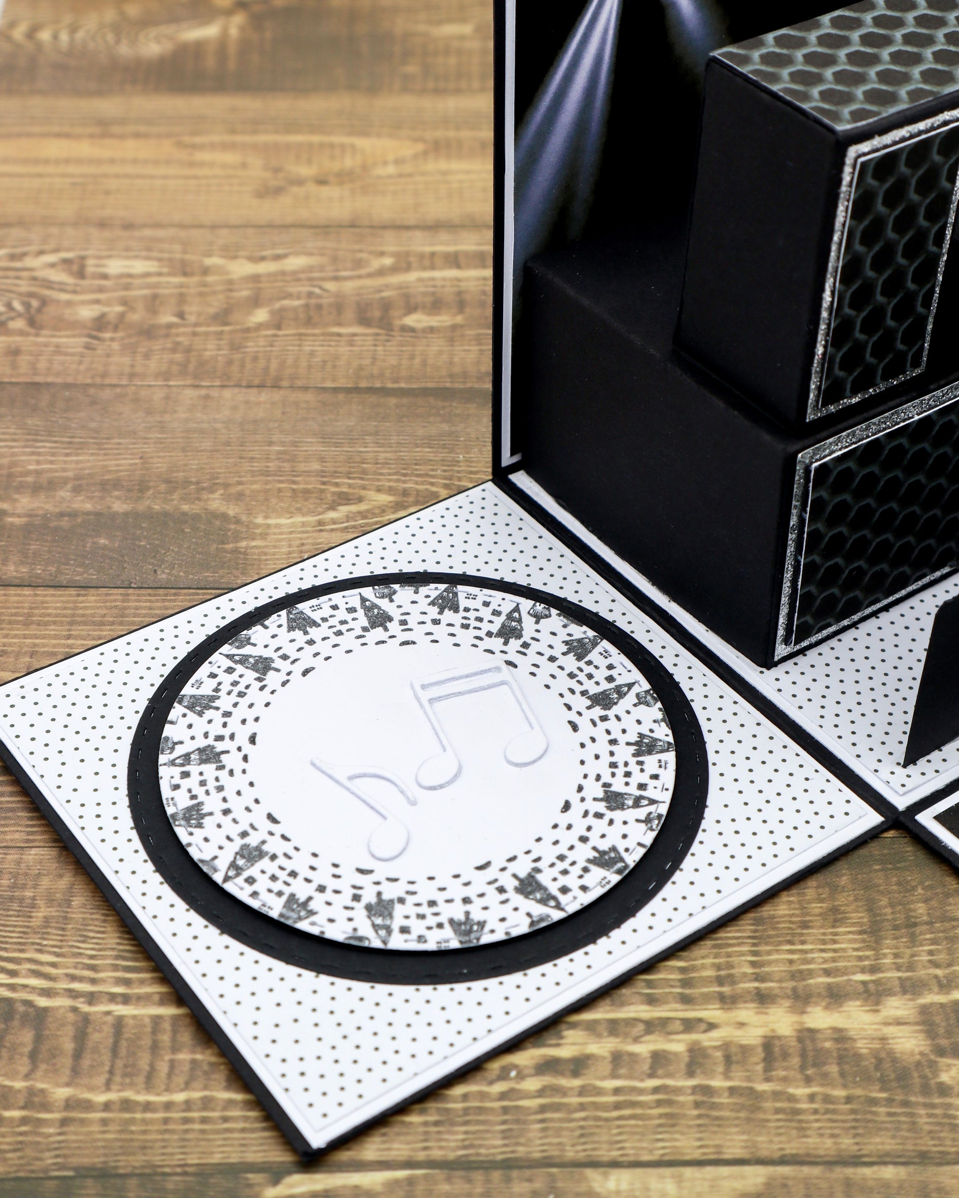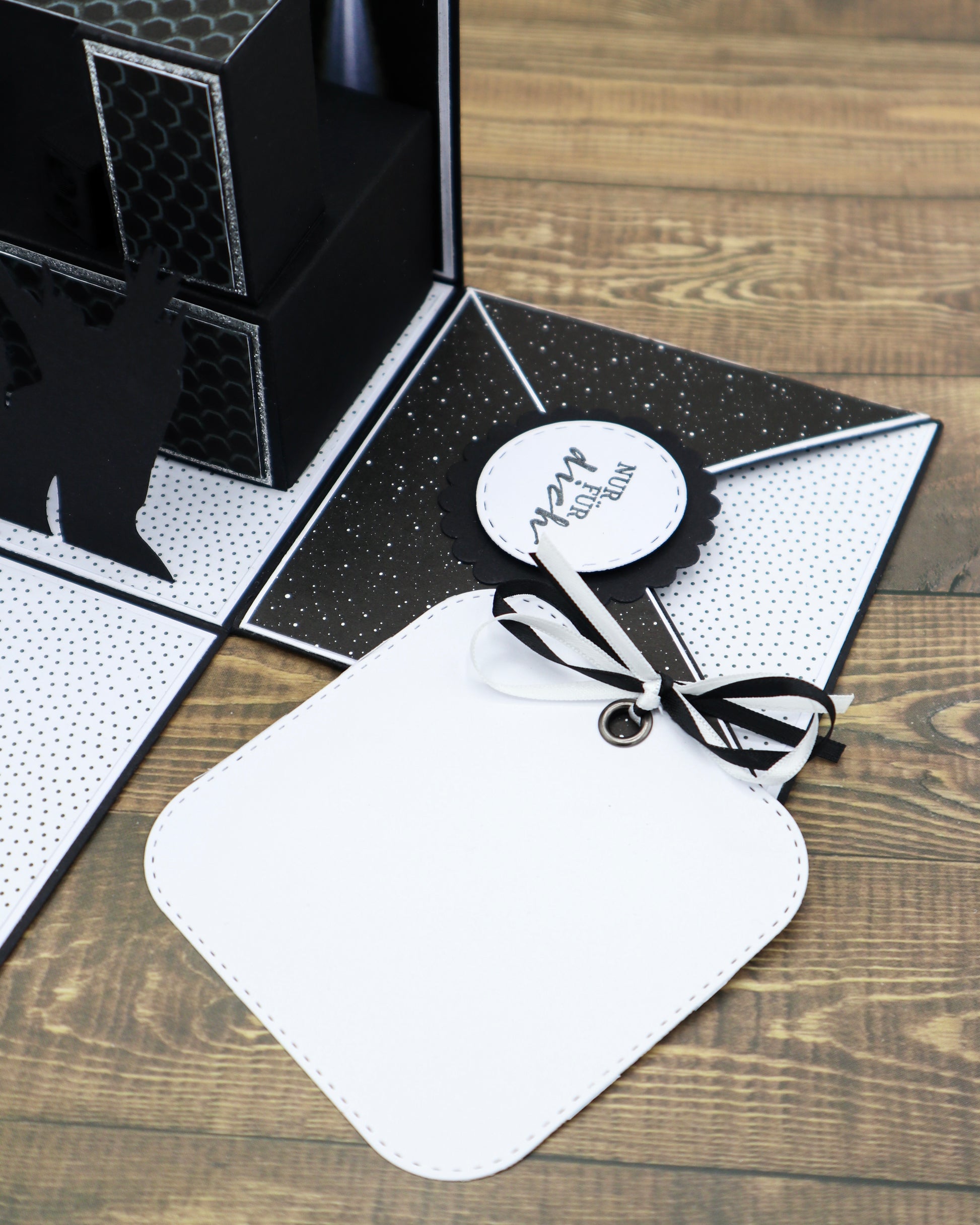 Diese Explosionsbox eignet sich sehr gut zum Verschenken von Konzertkarten. Diese passen perfekt in das Fach mit der Aufschrift "Ticket" rein.