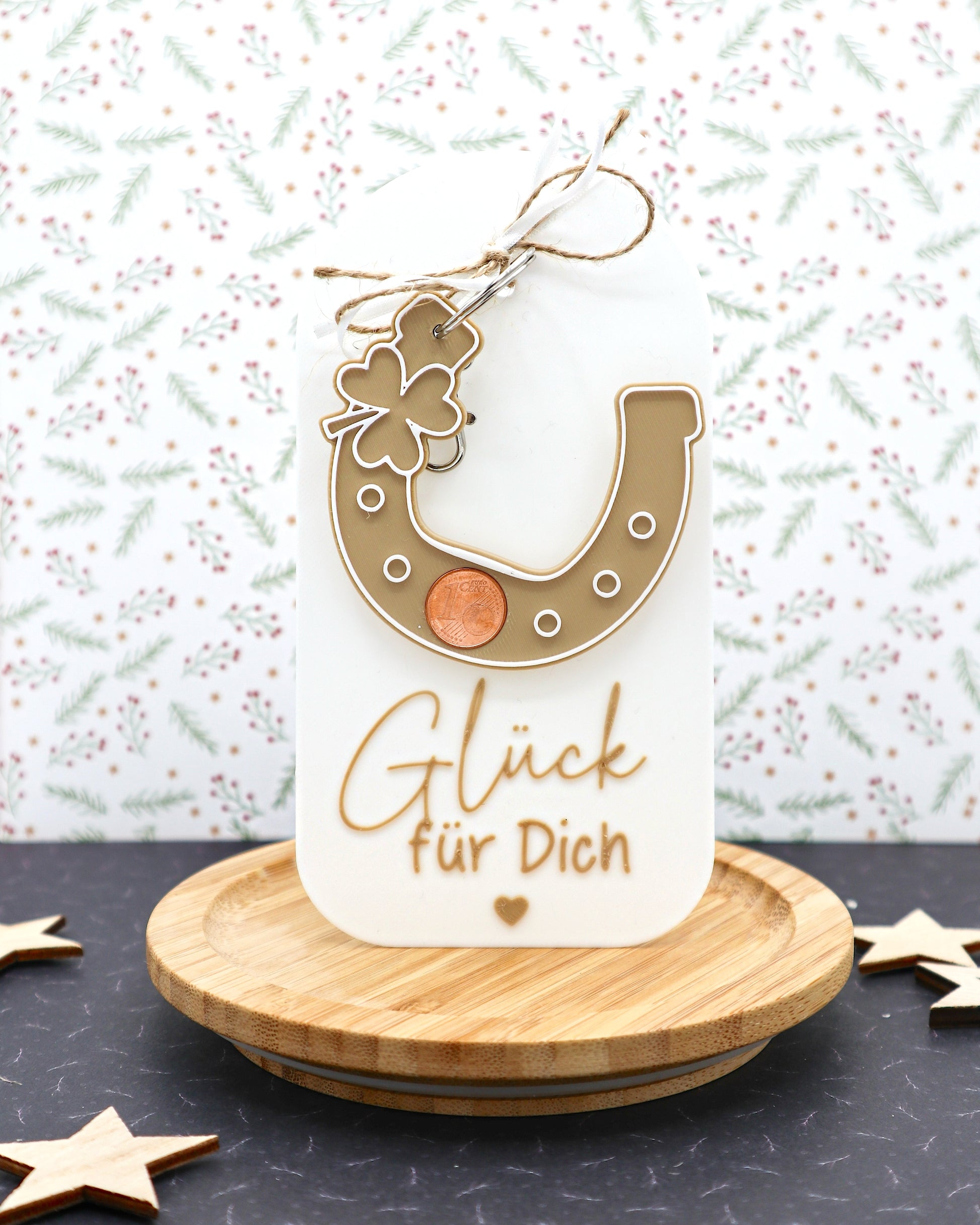 Jeder Glücksbringer kommt auf einer hochwertigen 3D gedruckten Geschenkkarte.